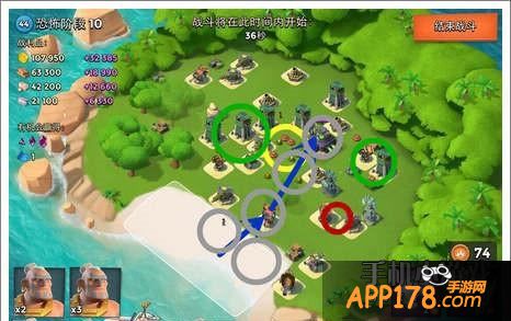 炸掉红圈内的5个防御建筑,然后直接从中间登陆去拆防御建筑,这关难度不大。