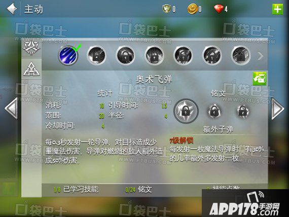 奥术飞弹:需引导,造成伤害,对燃烧的敌人可以造成额外伤害,尽量放在炎爆术之后使用。三个铭文分别是额外子弹、霰弹和溃击。额外子弹和溃击都是提升单体伤害的铭文,只不过前者比较看脸,如果用炎爆术的话溃击的效果会明显好;霰弹是AOE型的铭文,当然实际效果也没有溃击好,所以这一层溃击基本完胜。