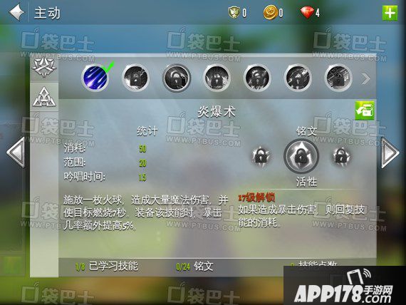 炎爆术:需引导,可以使敌人燃烧,同时自身暴击值提高。三个铭文分别是猛击、活性和分裂。三个铭文分别对应单体伤害、续航能力和AOE,各有各的特色,需要及时的切换。