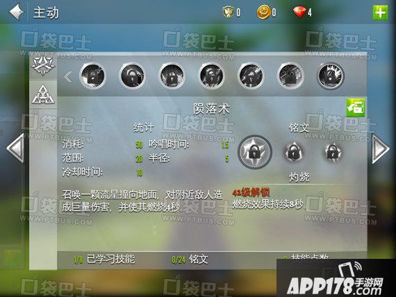 陨落术:法师爆炸AOE伤害,可使敌人燃烧。三个铭文分别是灼烧、活性和终极。活性并没有太大的用处;灼烧可以显著的增强上海,重击为PVP的范围控制技能。
