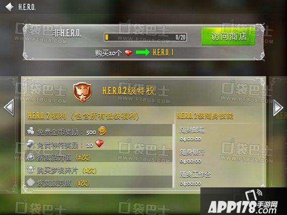 游戏中根据充值金额的不同,H.E.R.O.等级也会有所差异,当然H.E.R.O.等级越高奖励也会更加丰富,无论是商店可购买的物品、每日礼包、签到奖励都会远远高过普通玩家。除此以外,还能获得更多的便携式功能,比如说随身邮箱、银行、工作台等。