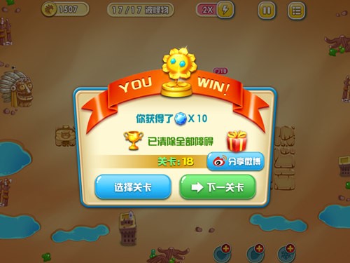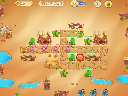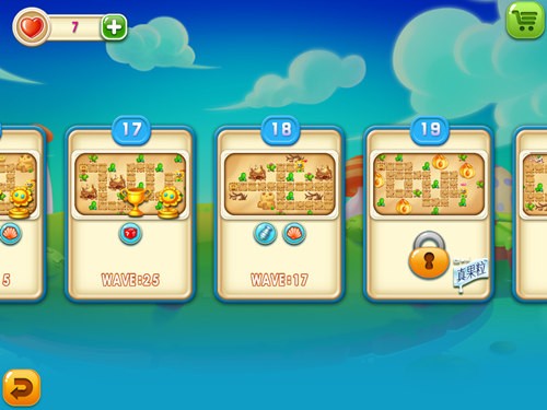 看到这样的配置,仿佛又回到刚开始的关卡,只有圆珠塔以及火焰贝壳塔而且初始资金才300,是否意味着难度很大呢。当然经过身经百战的各位玩家相信已了解火焰贝壳塔要成为本关的主力了。17波的攻势并不算多,还得看该关卡的地形和障碍物如何分布。