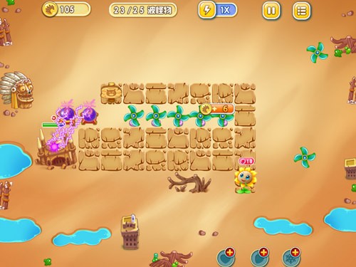 本关的防御塔配置有多种,但大多都没什么用处,风车塔可以作为本关的首选。25波的攻势很多,所以有较多的时间用来清除障碍物。600的初始资金也让前期能够有更多的风车塔出现。