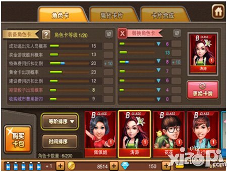 游戏初始,共有7名角色供你选择,7名角色对应了电视节目中的7个明星哦。每个明星的属性值不同,各有各的特点,玩家可以根据自己的爱好进行选择即可。初始获得的角色都是C级的,玩家可以通过抽卡或者合成获得更高等级的卡片,并且更换为自己的角色卡。