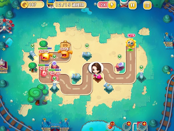 不过本关的难点反而在于障碍物的清除,虽然关卡中单个障碍物并不难清除,只需一根圆珠塔即可,但由于分布过于分散所以需要到每个区域中都建造防御塔来清除障碍。只有8波的攻势也就意味着在清怪的同时也要把握好每一波有限的清障碍时间。建议本关不要使用2倍速,保持原速才能更稳定的清除障碍。