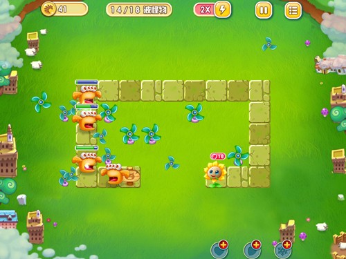 过关策略:首先建议玩家在中间地带建造风车塔并对其进行升级,这样该风车塔即可打击到上下两个方向的防御塔。另外,要注意的是前期玩家需要手动控制风车塔,这样才不至于让风车塔都在打击下方的怪物,而忽视了逃过的怪物。还有风车塔也可建造在左侧的路口处,这样就可以直接穿透到后面大部分的障碍物,是很好的塔防布局位置。