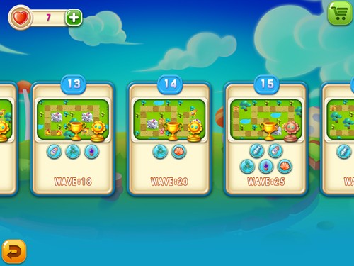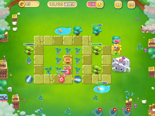 过关策略:如果你打算在本关使用大量的风车塔,那么建议在出口处就建造两根风车塔,这样怪物一出现就能够被打击到,且还会穿透路径上的障碍物。中后期在出口处建满所有风车塔即可,风车塔需以量取胜。如果你想使用火焰贝壳塔,那么只需在每个十字路口或是转弯处设置摆放,并加以升级即可。火焰贝壳塔的群伤范围和杀伤力都不错,清怪同时也能将周边的障碍物一并清除,也是很好的防御塔。