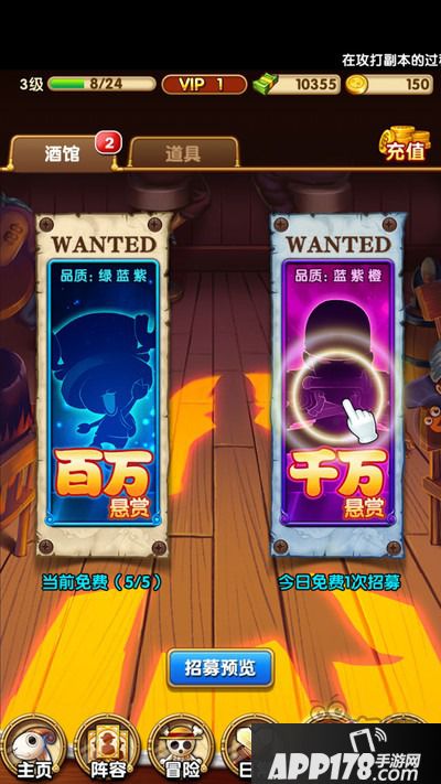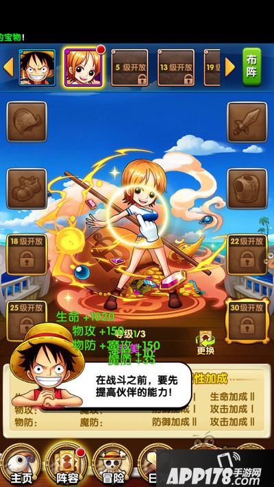 《航海王强者之路》在玩法上也就是传统的卡牌操控模,并没有创新和亮点,玩家只需要在战斗前设计好英雄摆放的位置,其他的交给系统和RP就可以了。可以说跟《我叫MT》没什么两样。这样操作虽然简单和省心,但缺点也非常明显,玩法比较大众化。