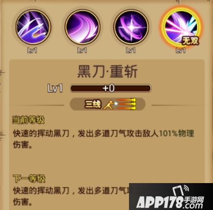基本介绍:三线范围,快速挥动黑刀,发出多道刀气攻击敌人,造成部分物理伤害。