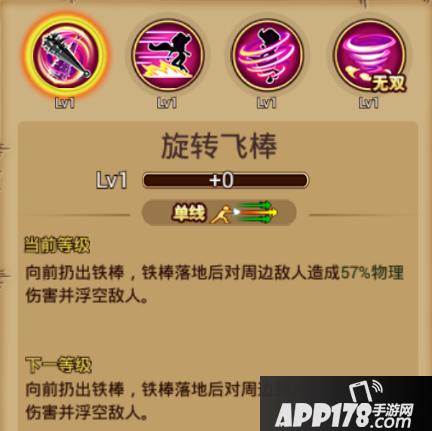 基本介绍:三线范围,拿着金刚棒进行回旋,对身边敌人造成部分法术伤害。