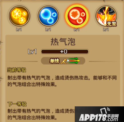 使用心得:单独释放热气泡无法造成伤害,需要2个气泡组合起来才能发挥特殊的效果。热气泡加热气泡组合起来的特殊效果是造成3线大范围的单次技能伤害(爆炸);热气泡加电气泡组合起来的特殊效果是释放一个向前移动的雷电球造成多次技能伤害。