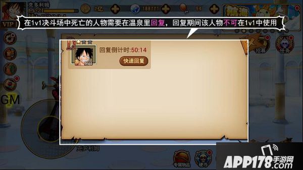 点击打开激战街界面中的温泉。通过温泉玩法可以恢复因为角斗场战败而休息的人物。还记得航海王中路飞等人在温泉中遇到青雉的情景么,让人物好好放松放松恢复精力,然后再继续征战角斗场吧!