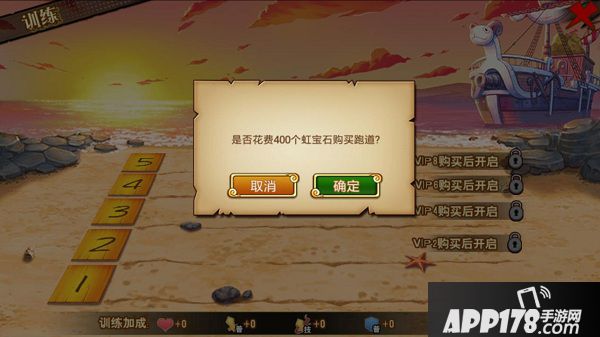 通关3-12“路飞VS克洛”后即可开启训练室系统。训练室共有5条跑道,初始开启一条,其他跑道需要达到对应的VIP等级后,通过花费一定的虹宝石进行开启。