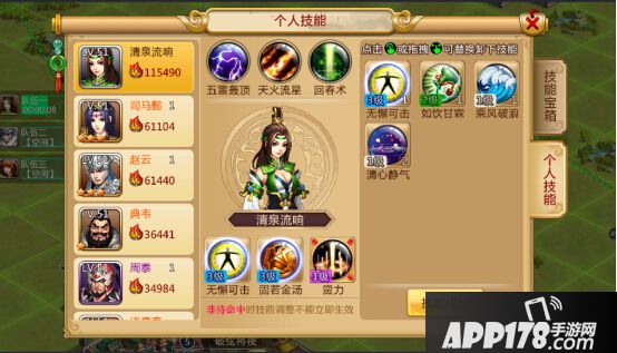 技能系统需要主公官职达到辅军护军才可开启,技能分为专属被动技能和普通被动技能,每个将领或主公都拥有三个技能槽,只能搭配一个专属技能。技能等级最高为五级。低级技能可以合成为高一级技能,专属技能需要技能石才可升级。