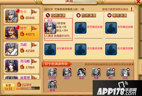 游戏里武将与武将之间有相互加成,在游戏中称为渊源系统。