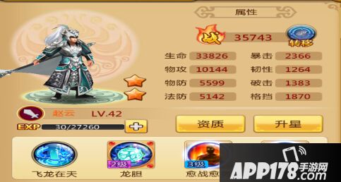 这个首冲6块钱,就可以获得的紫色攻击将领可以说一点也不比某些橙将差,可以做为输出也可以做半肉半输出。总体来说是个万金油型武将,怒气技飞龙在天对目标造成151%的伤害并在较长的一段时间内每次攻击必暴击并可恢复伤害值84%的生命值。配上专属技龙胆,专攻弱点和愈战愈勇。输出很强。充值30元就可获得将领升橙书。升橙后输出更强