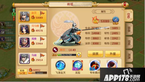 在信息中,主公们可以看到将领的属性、资质、技能、升星等武将的各项属性,其中武将的资质,技能,星级决定了一个武将的战力。