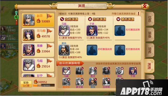 武将渊源在主公等级24级开启,拥有多名武将可以提升武将的属性和军势,其中渊源武将的星级越高,渊源武将的人数越多,提升的属性与战力越多。