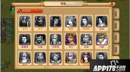 在图鉴当中可以看到已获取的武将,未获取的武将和可升橙的武将,点击武将还可看到武将的专属技能与推荐技能搭配。