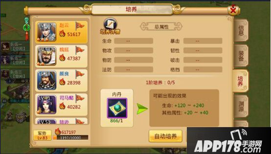 将领的培养需要官职到达辅军领军才可以开启,可以使用内丹来提升将领的属性,培养等级分为普通、良好、优秀、卓越、完美,一阶只能培养五次,阶级越高可培养次数越多。