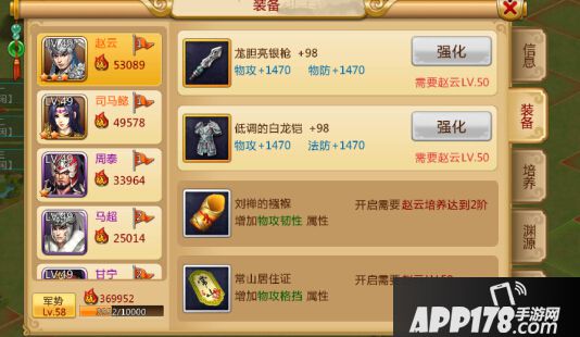 每个武将都有专属于自己的四件装备,每件装备都会增加武将的属性,并且可以强化使其增加的属性提升,强化等级上限为武将的等级X2。其中第一件为初始装备其他三件需要通过一定的条件才可以解锁使用。