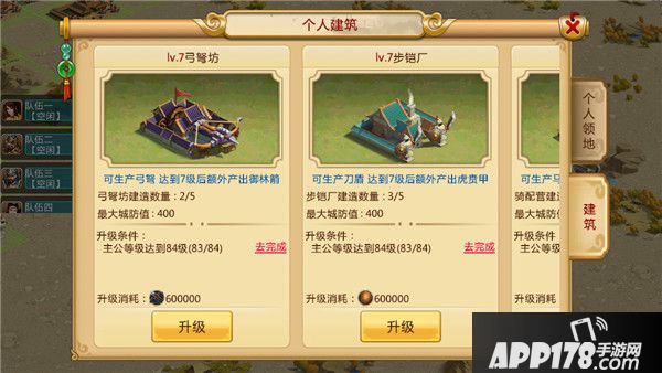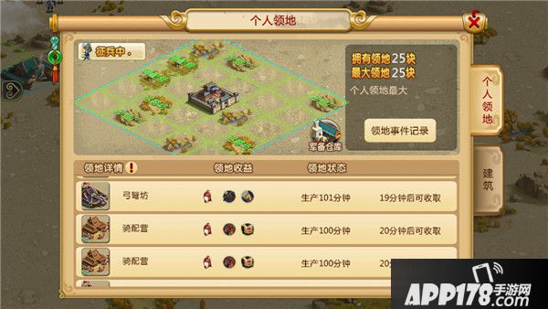 而我们可以在个人领地里建造相应的兵种设施,比如你队伍里以弓兵为主,可以多建几个弓弩坊。不过要注意的是,骑配营、弓弩坊和步铠厂这三个建筑是共用额度的,要建哪些就根据自己的需求哈。