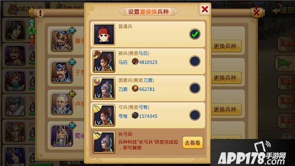 之后我们就可以在队伍里面给各个武将进行更换兵种,不过前提是材料得足够,比如主公想改为弓兵的话,如果主公的战力是60万,那么就要消耗60支弓箭,后续补兵时同样需要消耗兵数相应的弓箭。兵种间也有相互克制的关系,因此一个队伍里最好有不同的兵种哦~
