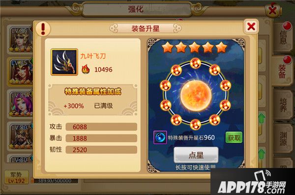 另外一个更重要的功能是将领特殊装备的升星。每个将领都有4个特殊装备的部位,而每个部位在升星满了后,会增加300%装备属性!而主公是没有特殊装备这一项的,也就是说,随着大家特殊装备的逐渐强化,主公在将领面前只会越来越脆。