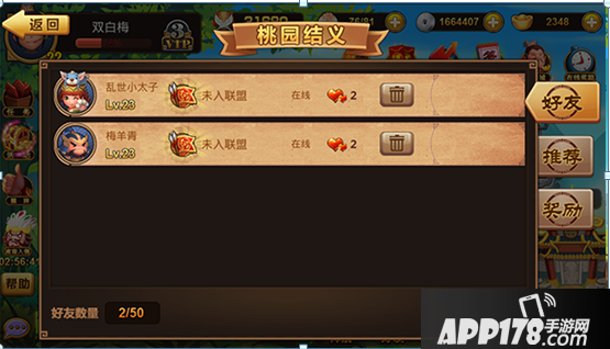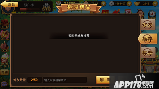 好友界面中分为好友、推荐、奖励三项功能。