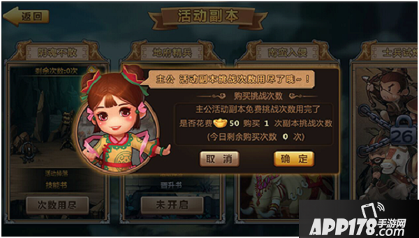 每天免费挑战次数为3次,挑战次数使用完毕之后,如果您的VIP到达一定等级,即可点击副本列表界面的加号购买额外挑战次数,如下图: