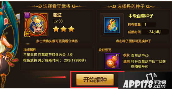 首先介绍播种功能,点击播种,会出现看守武将和选择播种种子界面。随便选择一个武将来看守,再选择需要播种的种子点击开始播种即可。