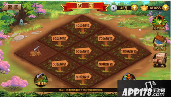 点击药园进入药园界面后,我们会看到播种功能和药园商店,还有好友灌浇、日志等功能。