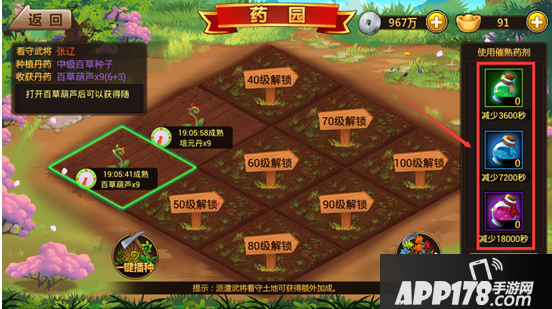 播种完毕后界面会显示成熟时间倒计时和收获种子品种个数,点击播种的菜地会有催药剂提示,催药剂可大幅度提升种子成长速度。不同额药水减少的时间不同。
