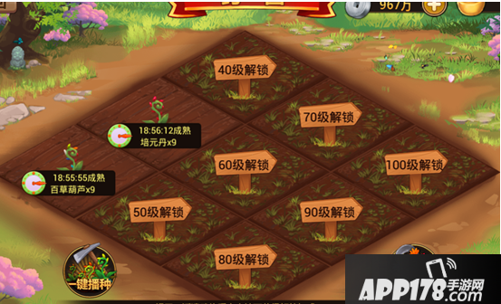 药园种植20级开启后,总共有9块田地,每隔10级解开一块田地,到达100级即可全部解锁使用。