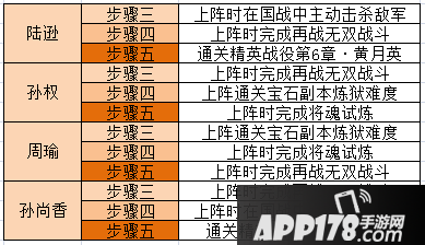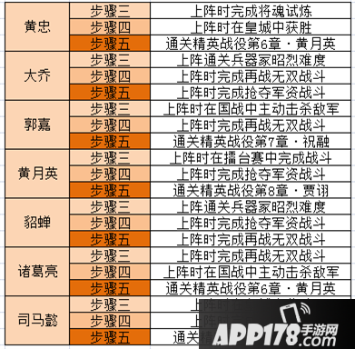 在打造好武将的专属神兵后,第三至第五步的完成条件均为在武将上阵的情况下,完成指定的日常任务。不同的武将对应的任务不同,将从运送军资、家族无双、国战破敌、攻克关卡等任务中完成指定三个,具体如下: