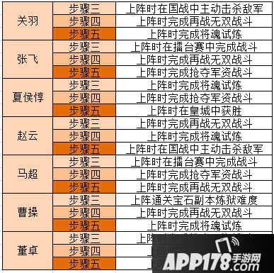 在打造好武将的专属神兵后,第三至第五步的完成条件均为在武将上阵的情况下,完成指定的日常任务。不同的武将对应的任务不同,将从运送军资、家族无双、国战破敌、攻克关卡等任务中完成指定三个,具体如下: