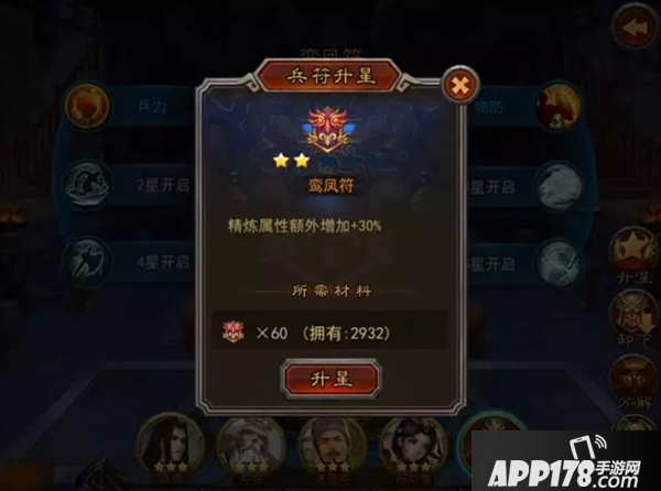 消耗同名兵符碎片后,可对兵符进行升星,升星后的兵符将直接提升原有的精炼属性,开放可精炼的最大等级,并且开放新的兵符属性。