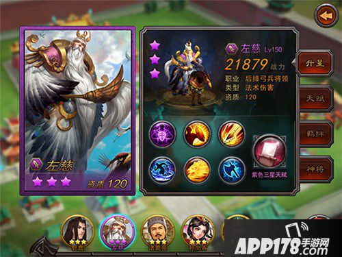 左慈,少明五经,兼通星纬,传有神道,可役使鬼神,死后幻化成仙。如此神乎其神的一个人自然有神佑之术。在《横扫千军》中,120资质的左慈作为后排弓兵将领,精通幻术,可对敌方造成大量的、持续性的伤害,同时,也是继孙权和陆逊之后,有一个具有死亡效果的亡语武将,相信左慈的出现,会让1T4A的阵容产生更多的组合类型。同时,左慈将成为神将羁绊不可或缺的一环,因此,不论你是不是走AOE阵容,左慈都会是你每一个神将必不可少的后盾之一。