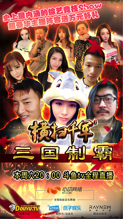1月16日(本周六)晚8:00,由心动网络畅销手游《横扫千军》全程冠名,原子娱乐制作的斗鱼tv史上最内涵综艺竞技show即将开启,多达11位知名人气主播将汇聚上海,重演三国历史,书写“统一中原”的史诗传奇!