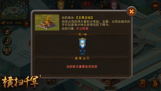 跨服国战仍旧将围绕侵略与守卫两大主题进行,不同区服的魏蜀吴三国将被划分入不同的小组,每组四个国家在同一块版图上角逐。通过占领城池扩充己方的势力范围,并收取城池产出的资源。当然每座城池都有不同的作用。【龙附】首占获得粮草,持续占领获得积分奖励,同时附带减伤和加伤buff;【至尊龙城】道域龙城中最重要的城池之一,持续占领可获得大量积分奖励。