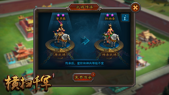 随着新武将一起更新的还会有新系统——武将传承。传承系统,将助主公大人们快速打造最强阵容。玩家可以通过消耗一定资源,将未上阵的神将的等级和品阶,毫无损耗的传承给另一个武将。不过,传承的CD时间比较长,所以玩家一定要珍惜传承机会哦!