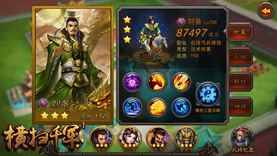 作为蜀汉的开国皇帝,三国最有影响力的人物之一,刘备的技能自然不敢怠慢。在《横扫千军》中,刘备属于法术型将领,技能【霸者仁心】输出相当恐怖,同时也是个攻守兼备的武将,不仅有长达15秒的保护效果,还有暴击,有控制能治疗。值得一提的是,刘备的出现,将让一些冷门武将如诸葛亮、貂蝉、陆逊等重获新生,并对主流的孙尚香加司马懿AOE阵容也会有一定限制。