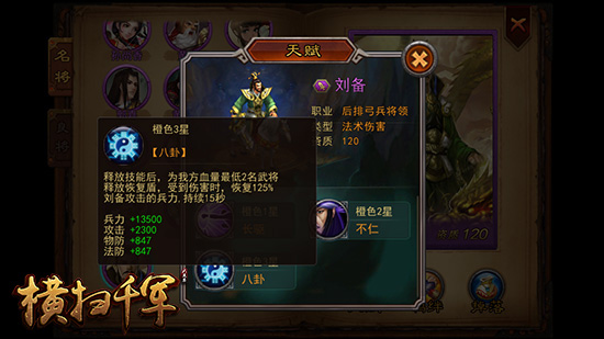 提供回复效果:橙三天赋【八卦】施放技能后,为我方血量最低2名武将释放恢复盾,受到伤害时恢复125%刘备攻击的兵力,持续15秒。橙三天赋类似于王元姬的雨露种子,在作用目标受到伤害时触发回复效果,虽然不能称作“神技”,但也是非常实用的辅助技能。要特别说明的是刘备是目前唯一一个单点阵容和群攻阵容都适用的武将。