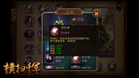 抗衡降气阵容:紫三天赋【千机】开场时,我方所有武将免疫降聚气和降聚气速度效果,持续5秒。控制武将释放技能较慢,如果遭遇司马、孙权等降气特效的敌人非常不利,刘备的紫三技能可以确保战斗中第一波技能交换的及时性。