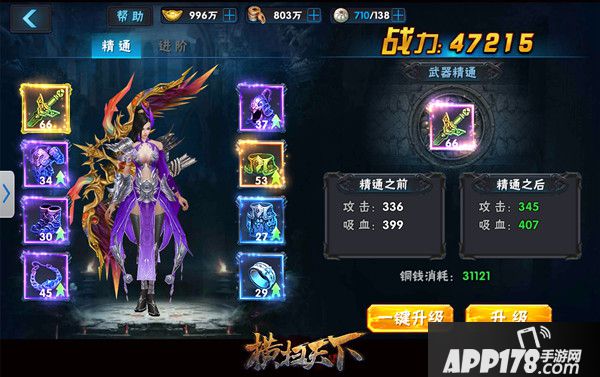 先前说过,装备按颜色的话是紫的、橙色、红色。上图精通等阶也和装备品质一致。提升对应装备部位的精通,起对应属性会增长。提升装备精通消耗铜钱。所以游戏中的铜钱非常有用。