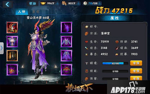 装备:有白装、绿装、蓝装、紫装、橙装、红色传奇装。装备按颜色,目前从低到高为白装、绿装、蓝装、紫装、橙装、红色传奇装。白装一般是打关获得的过度装备,紫色装备是大批玩家的标配了,那么最厉害的红色传奇装备自然就是土豪的象征了。