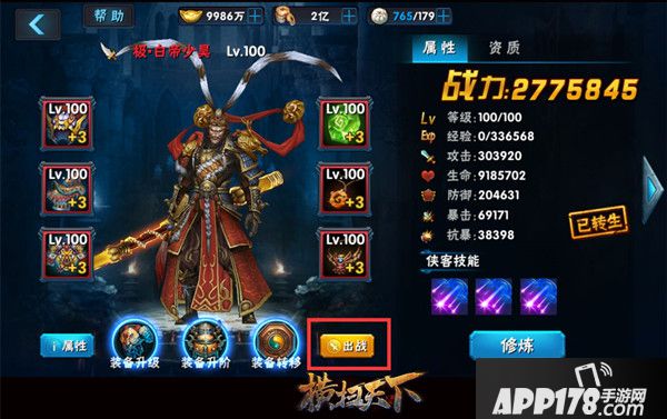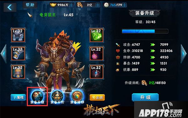 天命战神装备升级后可以获得更高的属性。装备等级不得超过天命战神等级。天命战神装备升级消耗铜钱。