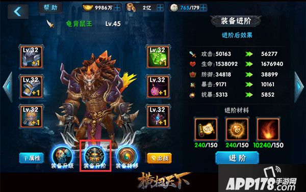 天命战神装备进阶后可以获得更高的属性。天命战神装备进阶消耗各种材料。