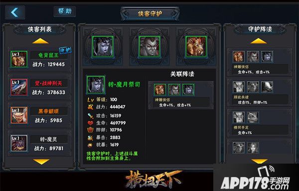 玩家可以选择多个天命战神守护,将他们的战斗属性,以一定的比例添加到自己的角色身上。特定的天命战神之间有守护阵法,可以额外提升玩家角色的战斗力。