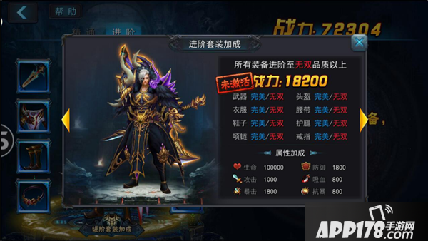 装备进阶套装越高,所加成的属性越高,附加战力值越高,收益性价比也非常的高。